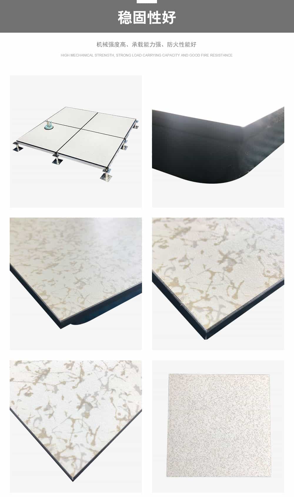 全鋼防靜電地板為全鋼組件,分有邊、無邊、微邊(三種邊處理方式)。底面采用SPCC深沖冷軋板拉伸成型鋼板厚度(0.4~1.5mm),球窩狀結構,增加地板的機械荷載強度。面板采用硬質SPCC鋼板(0.5~2.0mm),上下經過點焊焊接成型,切邊沖孔后,經防銹處理,環氧樹脂粉末靜電噴涂后,中間填充發泡水泥(可以根據客戶需求發泡不同重量),再經過日曬養護后形成穩定的承載結構。地板上表層粘貼防火板(HPL)/復合PVC/ 通體PVC/陶瓷地磚等不同材質的裝飾表層,達到產品花色的多樣性、可以根據客戶需求個性化定制產品。搭配聯網支架、支架、螺釘組裝后,定位聯接更加準確、精度可靠。