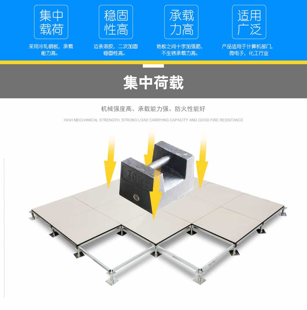 全鋼陶瓷防靜電地板采用上海寶鋼合金冷軋鋼板,經拉伸后點焊成形。在瓷質面層的生產過程中,均勻注入防靜電添加劑,由于面層的耐磨性,防靜電性能可以保持20年以上。而且系統電阻穩定、經信息產業部防靜電協會檢測,各項性能均達到要求。全鋼陶瓷防靜電地板系統有地板、橫梁、支座組成。橫梁和自身高度可調的支座用螺釘連結成穩固的下部支承系統,地板鑲嵌入橫梁圍成的方格內。