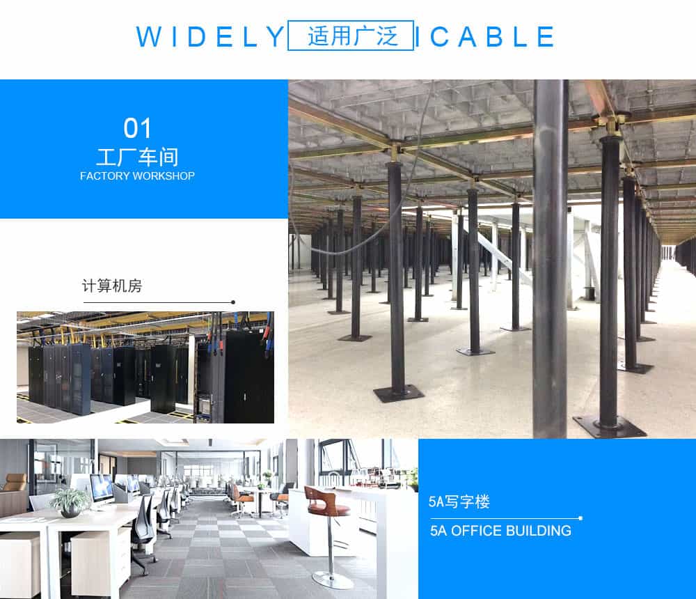 該地板可以選配帶出線口的配置,可根據要求任意添加線槽布線更具靈活性。此地板可以將強、弱電分開隔離,同時也便于檢修。安裝采用無梁角鎖,具有牢靠、穩定、調平、簡便之特點。